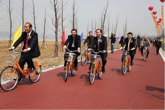 2012年3月26日,環太湖風景路建設啟動儀式在吳江市與浙江省湖州市吳興區交界處舉行,參加啟動儀式的國家住建部總工程師陳重、江蘇省副省長何權、浙江省副省長陳加元等領導在蘇州市副市長吳江市委書記徐明、吳江市代市長梁一波的陪同下,到吳江濱湖新城生態公園體驗公共自行車。