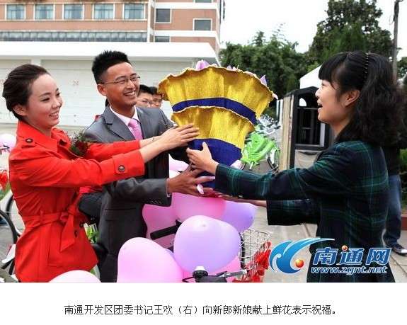 2011年10月26日,一場別開生面的自行車騎行婚禮在南通開發(fā)區(qū)上演?;槎Y主角——新郎朱吉鵬和他的新娘瞿曉波雙雙騎上自行車,在親朋好友的陪伴下沿著開發(fā)區(qū)主要道路騎行一周,低碳、綠色的自行車騎行婚禮吸引了眾多市民的眼球。