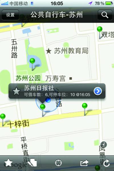 昨天,記者在自己的手機上下載了其中一款叫做公共自行車的軟件試用。這款軟件目前已經(jīng)覆蓋了蘇州、常熟、昆山、吳江、南通等地。選擇蘇州后,蘇州地圖出現(xiàn)在屏幕上,一個個綠色大頭釘就代表著一個個公共自行車網(wǎng)點。隨便點擊一個點,就可以看到這個公共自行車的站點名稱、可借車數(shù)、可停車位等信息。